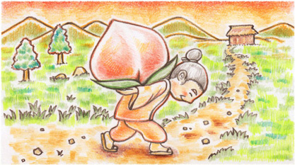 「これはおいしそうな桃だこと」ばあさまは喜んで、大きな桃を拾うと家へ持って帰りました。.